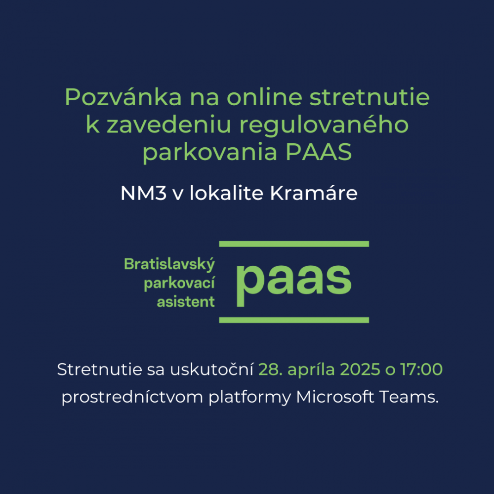 15.04.2025 - Pozývame vás na online stretnutie k príprave zavedenia regulovaného parkovania PAAS v lokalite Kramáre, ktoré sa uskutoční 28. apríla 2025 o 17:00 prostredníctvom platformy Microsoft Teams.
